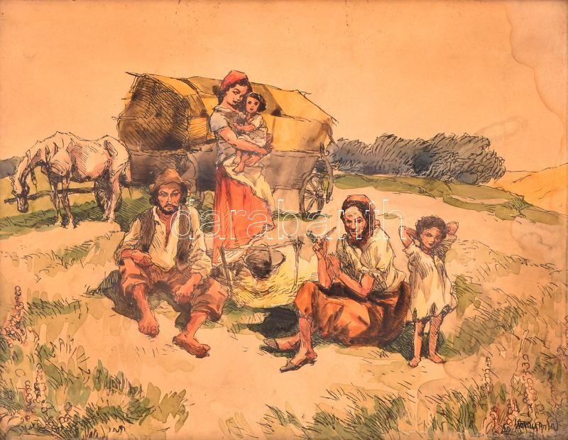 Kovács Antal (?-?): Cigány család. Akvarell-tus, foltos papír, jelzet...