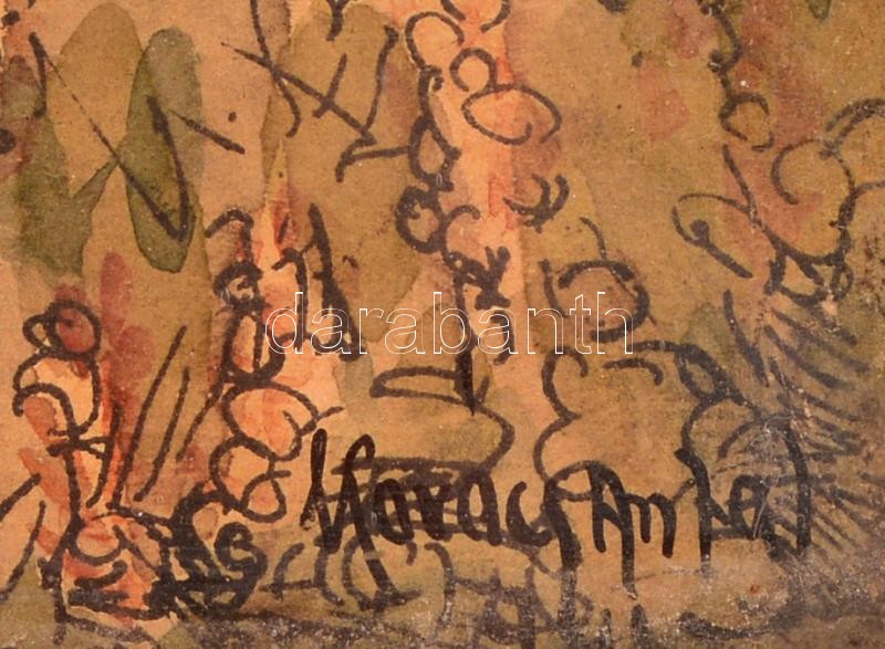 Kovács Antal (?-?): Cigány család. Akvarell-tus, foltos papír, jelzett, üvegezett keretben, 23×30 cm