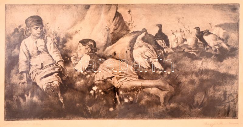 Magyar Mannheimer Gusztáv (1859-1937) - Prihoda István (1891-1956): Gyöngytyúkokra vigyázó gyerekek. Rézkarc, papír, jelzett, üvegezett keretben, 23,5×46 cm
