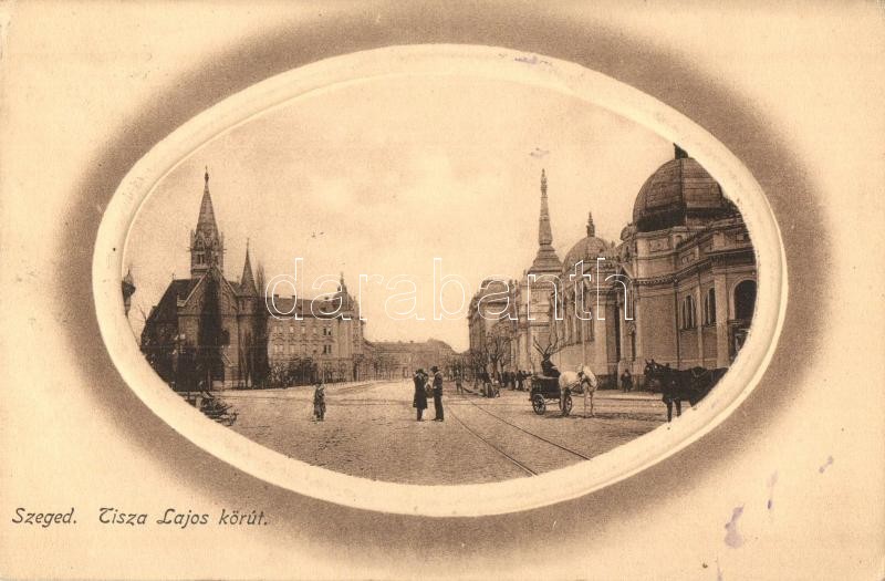 Szeged, Tisza Lajos körút, lovaskocsi, templom. Kiadja Juhász István (...