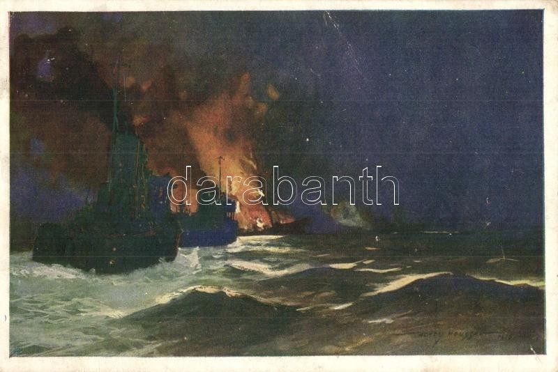 Eine österreichisch-ungarische Flottille versenkt in der Nacht einen mit drei Geschützen armierten Dampfer und einen größeren italienischen Motorsegler, vollbeladen auf der Fahrt von Brindisi nach Durazzo / Egy osztrák-magyar flotta elsüllyeszt egy három ágyúval felfegyverzett gőzöst és egy nagyobb motoros vitorlás hajót éjszaka, úton Brindisiből Durazzoba / WWI Austro-Hungarian K.u.K. Kriegsmarine flotilla sinks an armed steamer with three guns and a larger Italian motor glider at night on the way from Brindisi to Durres s: Harry Heusser (EK)
