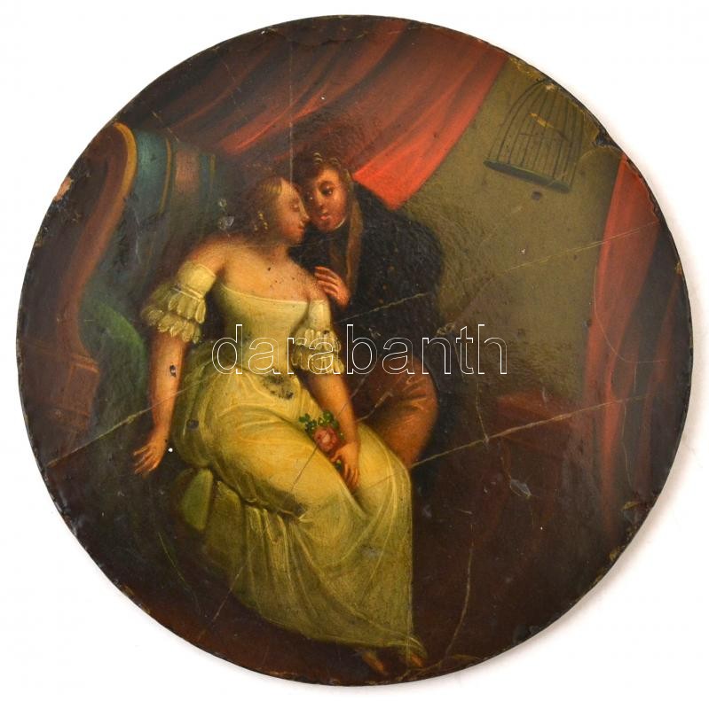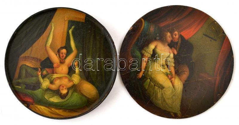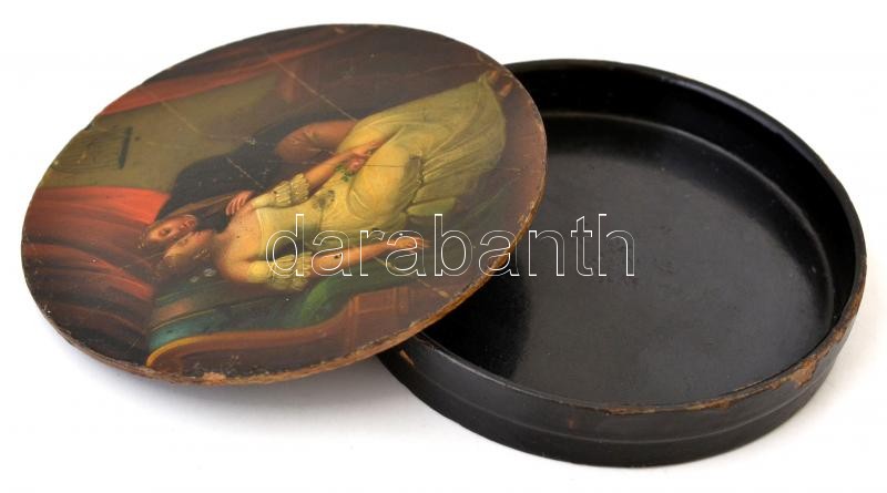 Kézzel festett pajzán jelenetes fa dobozka, tető és alj nem illenek össze, karcolásokkal, jelzés nélkül, d:8,5 és 8,8 cm