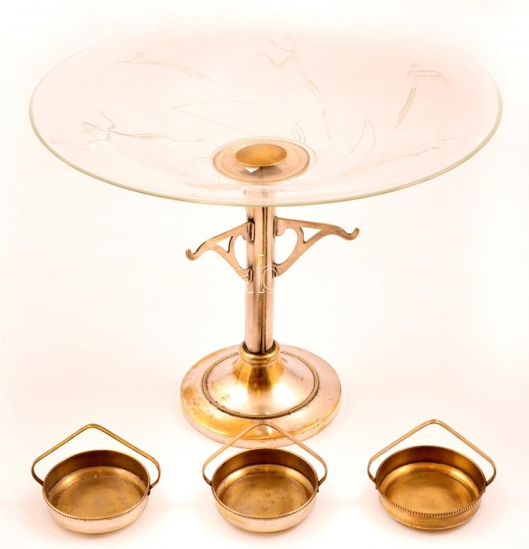 Lenk Austria talpas alpakka kínáló, három kosárkával, jelzett, csiszolt üveggel, apró csorbával, m:32 cm, d:37,5 cm