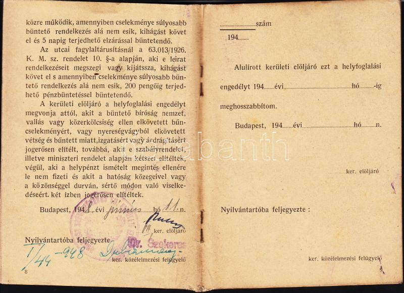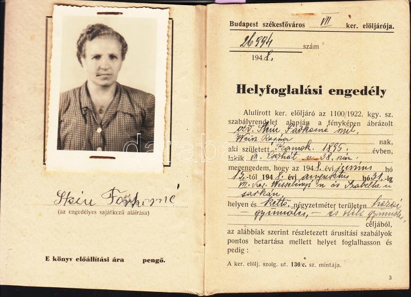 1948 Fényképes helyfoglalási engedély hazai és déli gyümölcs árusítására (VII. Wesselényi és Izabella utca sarkán)