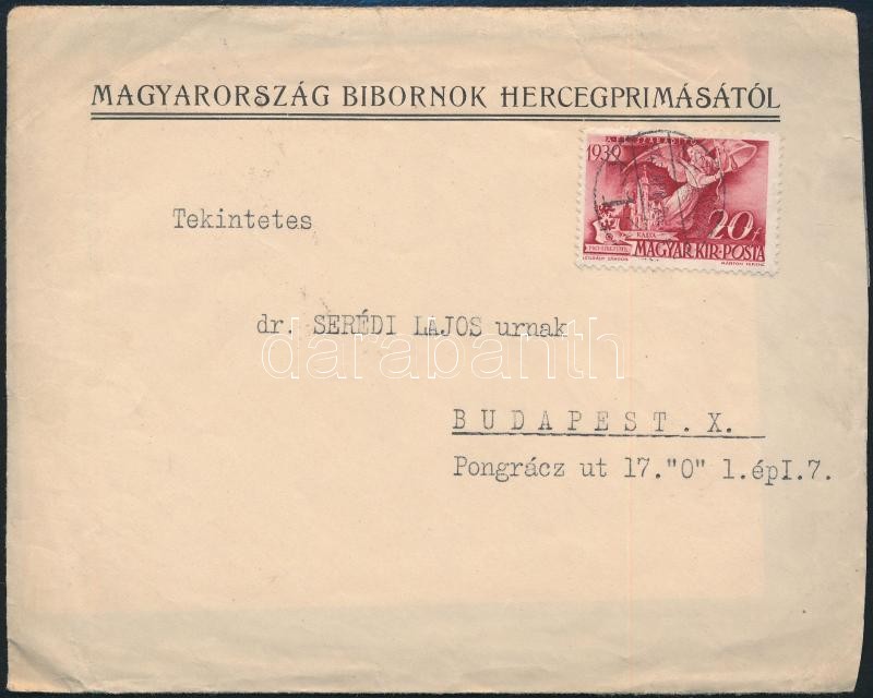 1940 Esztergom, Serédi Jusztinián (1884-1945) bíboros, hercegprímás gépelt köszönő levele öcsének, Serédi Lajosnak, születésnapi és névnapi jókívánságai alkalmából, hercegprímási fejléces papíron, saját kezű aláírásával, borítékkal.