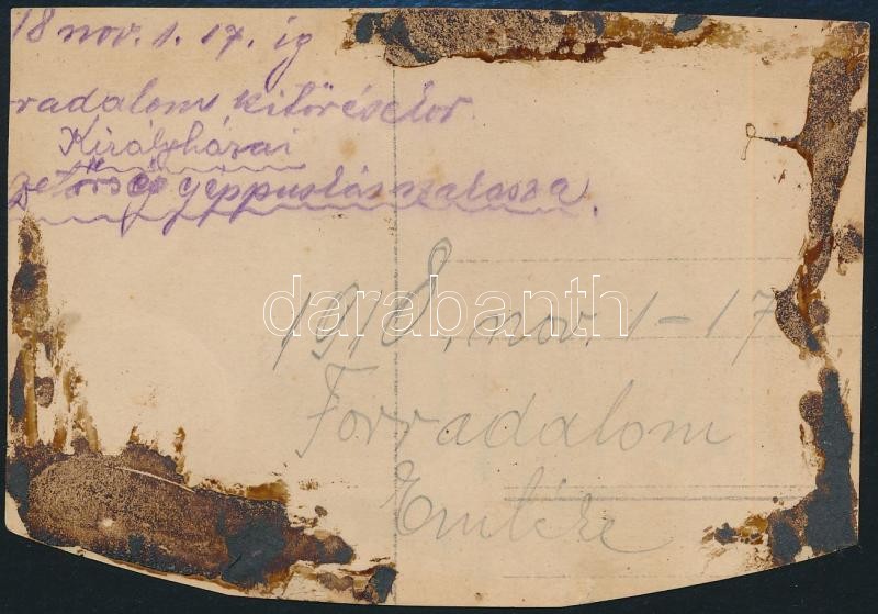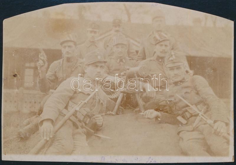 Description: 1918 A forradalom kitörése után felállított királyházai (Kárpátalja) nemzetőrség géppuskás szakasza, hátoldalon feliratozott fotó, körbevágva, 7,5×10,5 cm