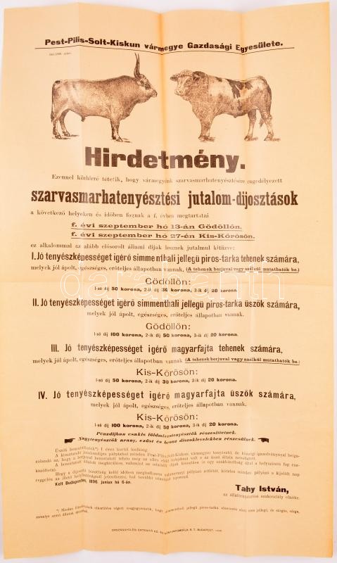 1896 Pest-Pilis-Solt-Kiskun vármegye gazdasági egyesületének hirdetménye szarvasmarha tenyésztési jutalomdíjazásról 31x54 cm.