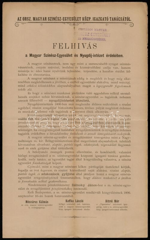 1896 Felhívás a magyar színész egyesület és nyugdíj intézet ügyében