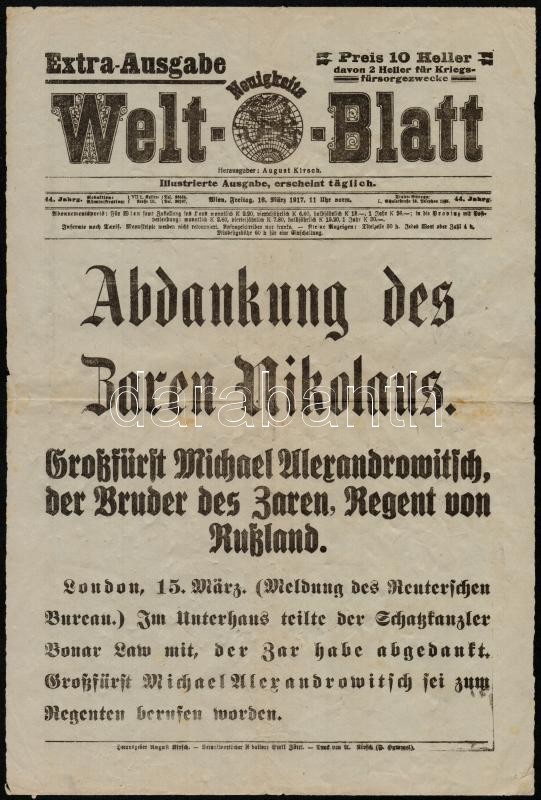1917 a Welt-Blatt különszáma, címlapján II. Miklós cár lemondásának hí...