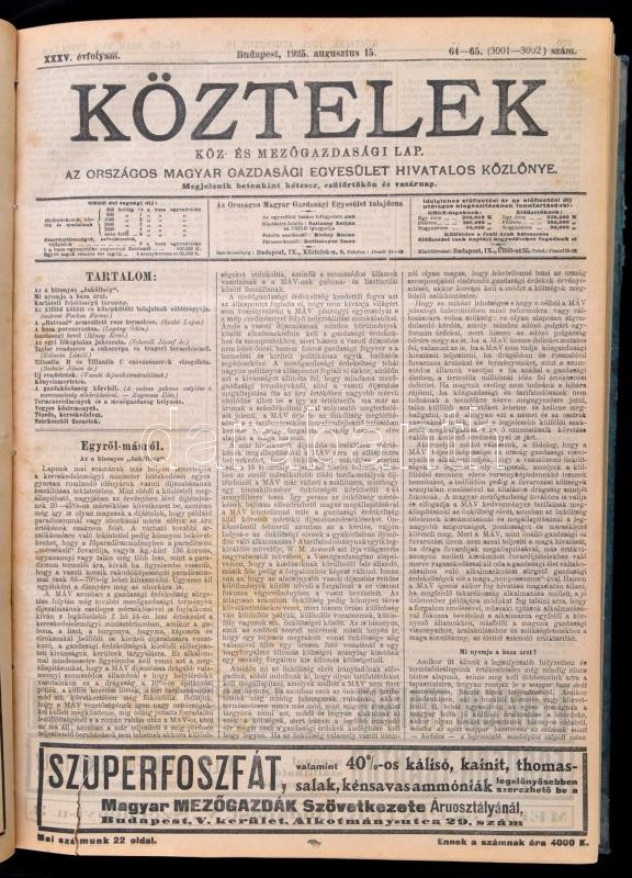 1925 Köztelek. Köz- és Mezőgazdasági Lap. Az Országos Magyar Gazdasági Egyesület Hivatalos Közlönye. Szerk.: Buday Barna, Rothmeyer Imre. 1925. július 5.-december 25. XXXV. évf. 52-103. sz. Fél évfolyam. Bp., 1925, "Pátria", 8+787-1590 p. Későbbi félvászon-kötés, kopott, foltos borítóval, az elejére a tartalomjegyzéket kötötték be, ami 1926-os kiadású (97-104 p.)