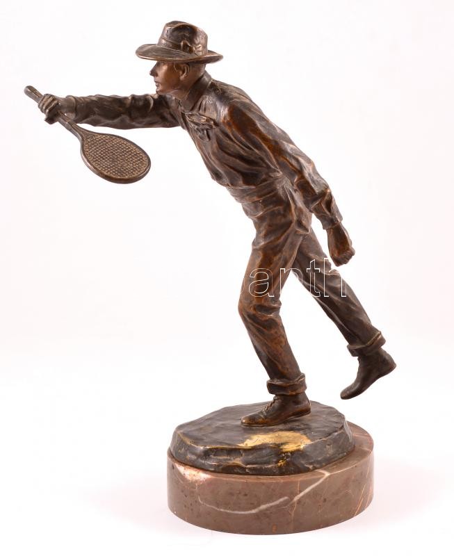 cca 1930 Olvashatatlan jelzéssel: Tenisz játékos. Bronz, márvány talpa...