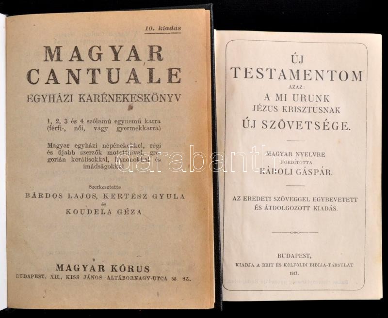 Description: Új testamentom. Fordította: Károli Gáspár. Bp.,1911, Brit és Külföldi Biblia-Társulat. Kiadói egészvászon-kötésben.+Magyar cantuale. Egyházi karénekeskönyv. Szerk.: Bárdos Lajos, Kertész Gyula, Koudela Géza. Bp.,é.n., Magyar Kórus. Átkötött modern egészvászon-kötés.