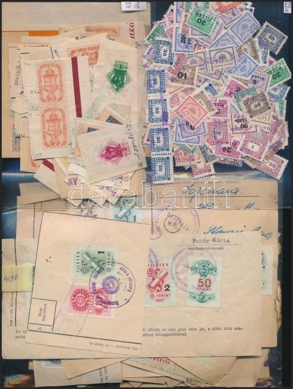 120 db okmánybélyeg kivágás, 300 db számlailleték okmánybélyeg, 104 db okmánykivágás sok bélyeggel