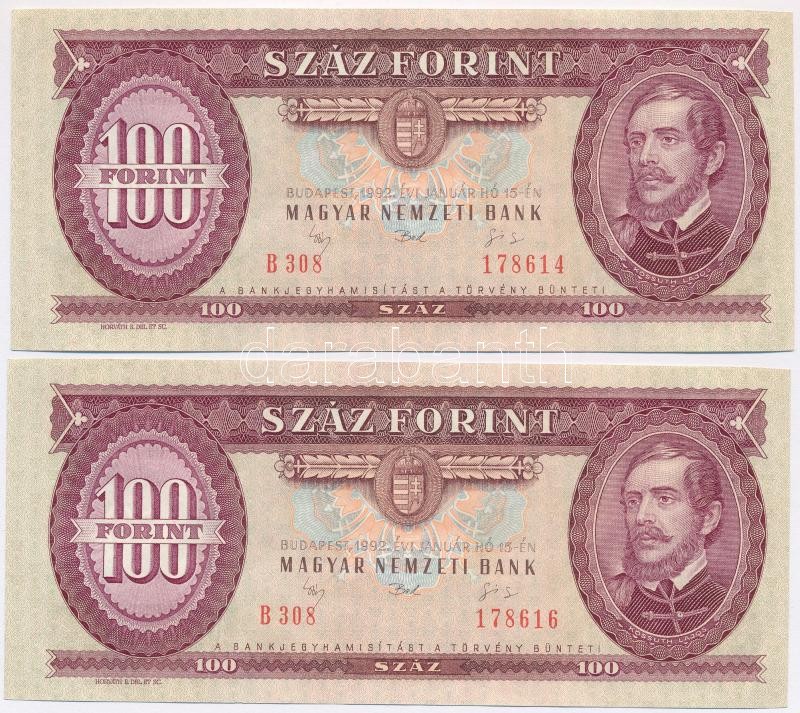 1992. 100Ft (2x) egyugrásos sorszámkövetők, nyomdai papírránccal T:II