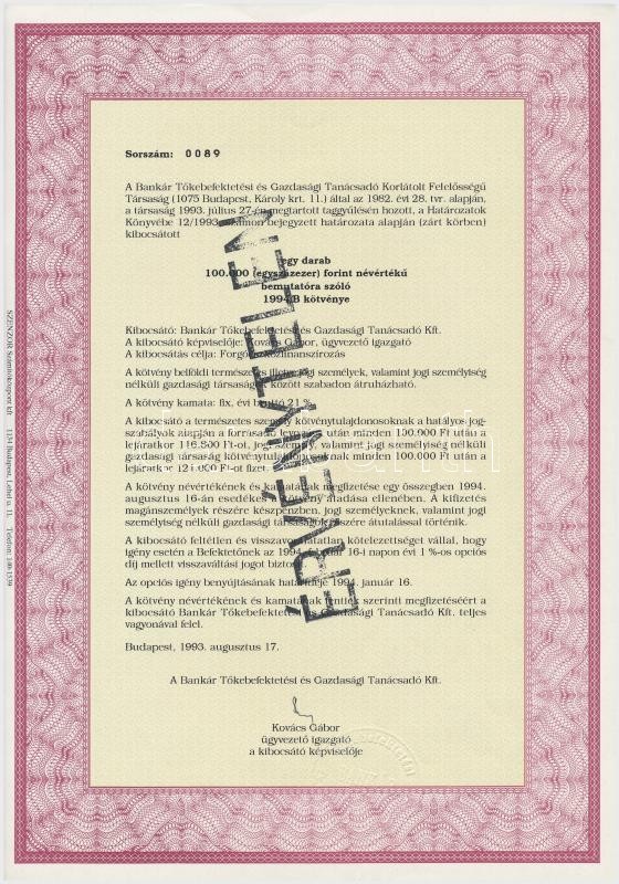 Description: Budapest 1993. "Bankár Tőkebefektetési és Gazdasági Tanácsadó Korlátolt Felelősségű Társaság" bemutatóra szóló kötvénye 100.000Ft-ról, szárazpecséttel, "ÉRVÉNYTELEN" bélyegzéssel T:I,I-