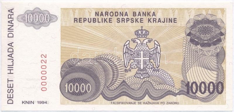Croatia / Republic of Serbian Krajina 1994. 10.000 Dinara with low "0000022' serial number, without prefix C:UNC,AU