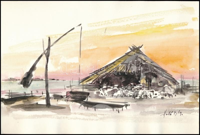 Holló jelzéssel: Pajta gémeskúttal. Akvarell, papír, 17×30 cm
