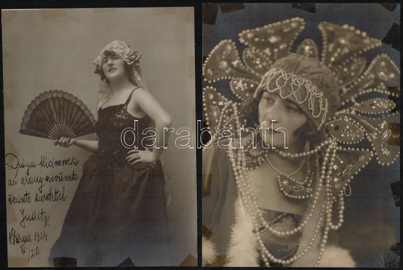 Description: 1924 Nagyvárad, a színház Judit keresztnevű színésznője, 4 db vintage fotó, az egyik dedikált, két képen cellux maradványok, 18,5x12 cm és 21,5x16 cm között