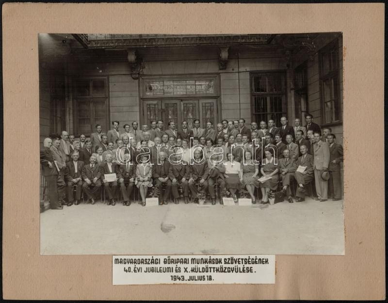 1943 A Magyarországi Bőripari Munkások Szövetségének 40. évi jubileumi és X. küldött közgyűlése, kartonra ragasztott, feliratozott fotó, 17×24 cm