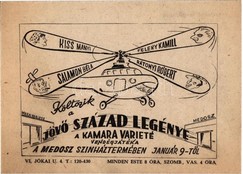Description: Költözik a "Jövő Század Legénye". A Kamara Varieté vendégjátéka a MEDOSZ (Mezogazdasági és Erdészeti Dolgozók Szakszervezete) színháztermében január 9-től. Kiss Manyi, Feleky Kamil, Salamon Béla, Rátonyi Róbert. Budapest VI. Jókai u. 4. / Hungarian theatre play advertising card and invitation (EB)