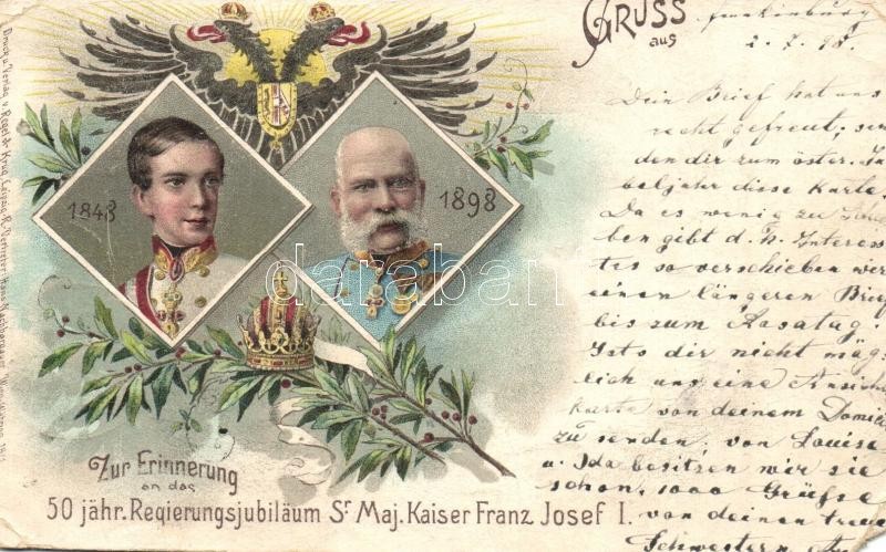 1848-1898 Zur Erinnerung 50 jähr. Regierungsjubiläum Sr. Maj. Kaiser Franz Josef I / Franz Joseph's 50th anniversary of reign. Regel & Krug Art Nouveau litho (cut)