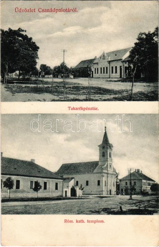 1908 Csanádpalota, Takarékpénztár, Római katolikus templom. Kiadja Kellner Jakab