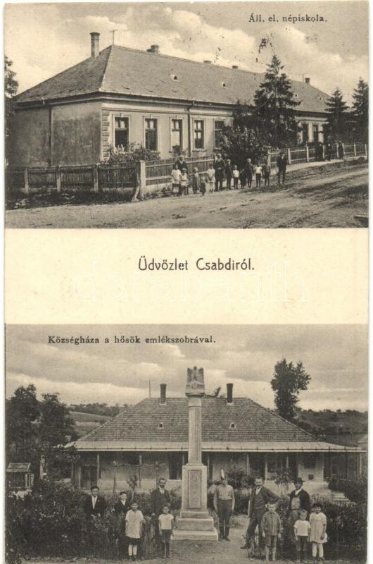 Csabdi, Állami elemi népiskola, gyerekek, Községháza a hősök szobrával...