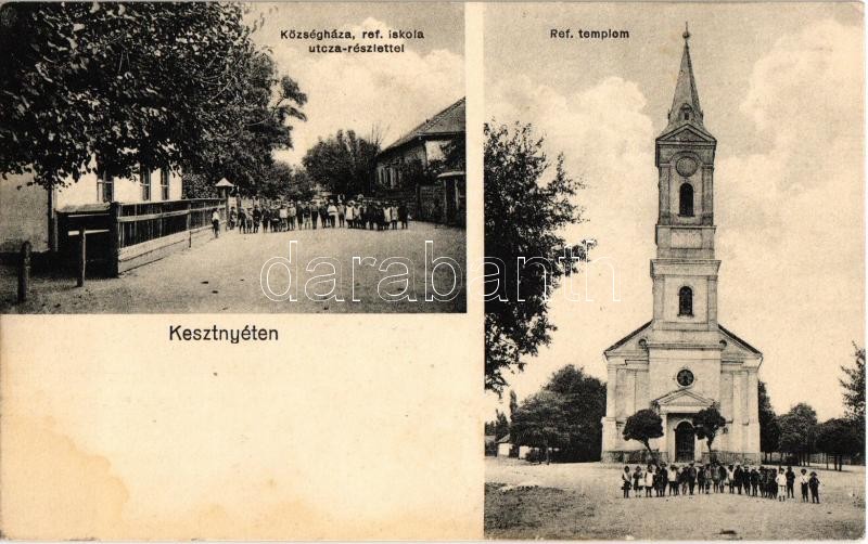 Kesznyéten, Községháza, Református iskola, utcakép gyerekekkel, Református templom (fl)