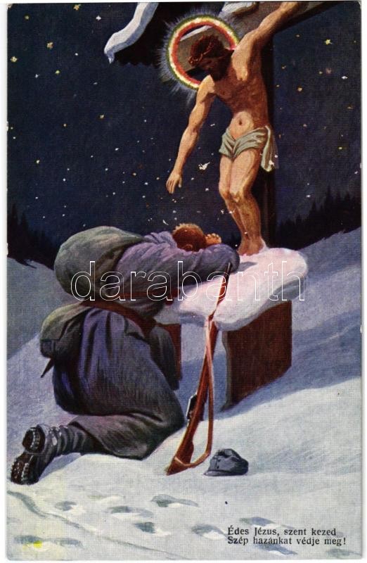 Description: Édes Jézus, szent kezed szép hazánkat védje meg! Kiadja a Szent István Társulat háborús képeskártyáinak karácsonyi sorozata / WWI Austro-Hungarian K.u.K. military Christmas art postcard, Jesus Christ
