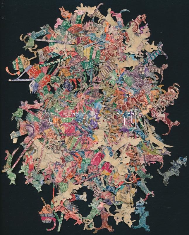 Régi bélyegekből összeragasztott és kivágott figurák, régen mókás képeslapok készítéséhez használták. Sok száz darab vagy több is.