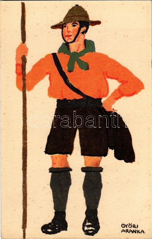 Cserkész művészlap, Diana sósborszesz reklám a hátoldalon. Ungarische Werkstätte / Scout. Hungarian art postcard, cream advertisement s: Győri Aranka