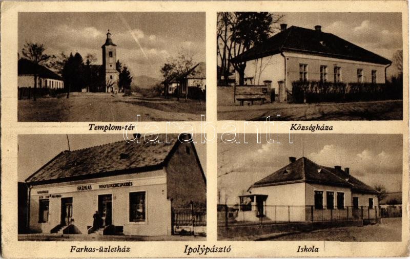 1943 Ipolypásztó, Pásztó, Pastovce; Templom tér, községháza, iskola, Farkas üzletház és Farkas Lászlóné kiadása / church, square, town hall, school, shop (EK)
