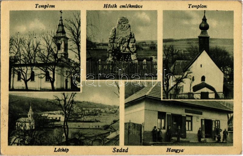 Százd, Sazdice; Evangélikus templom, Hősök szobra, emlékmű, Római katolikus templom, látkép, Hangya Szövetkezet üzlete és saját kiadása