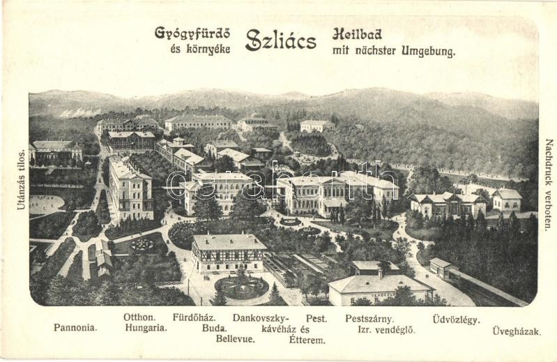 Szliács, Sliac; Gyógyfürdő és környéke: Pannonia, Otthon, Hungaria, Fürdőház, Buda, Bellevue, Dankovszky kávéház és étterem, Pest és Pestszárny szálloda, Izraelita vendéglő, Üdvözlégy, Üvegházak / hotels, Jewish restaurant, greenhouse, café, villa