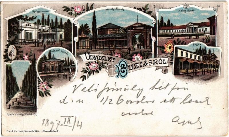 1897 (Vorläufer!!!) Buziásfürdő, Buziás, Baile Buzias; Gyógyterem, Mihály forrás, Meleg fürdő, bazár, József forrás, Fasor a meleg fürdőhöz / spa hall, bathing house, warm bath, thermal spring, bazaar. Karl Schwidernoch Art Nouveau, floral, litho (EK)
