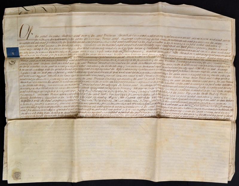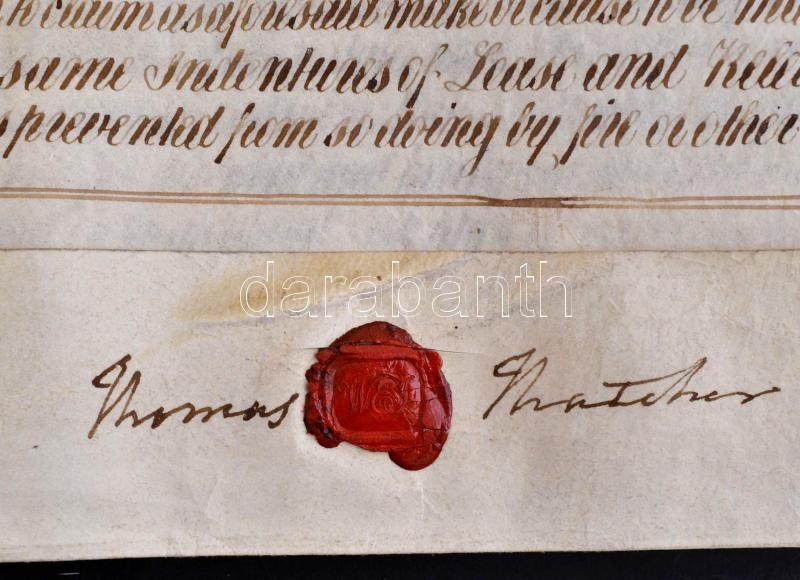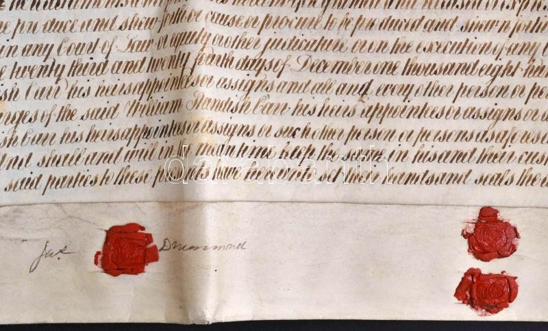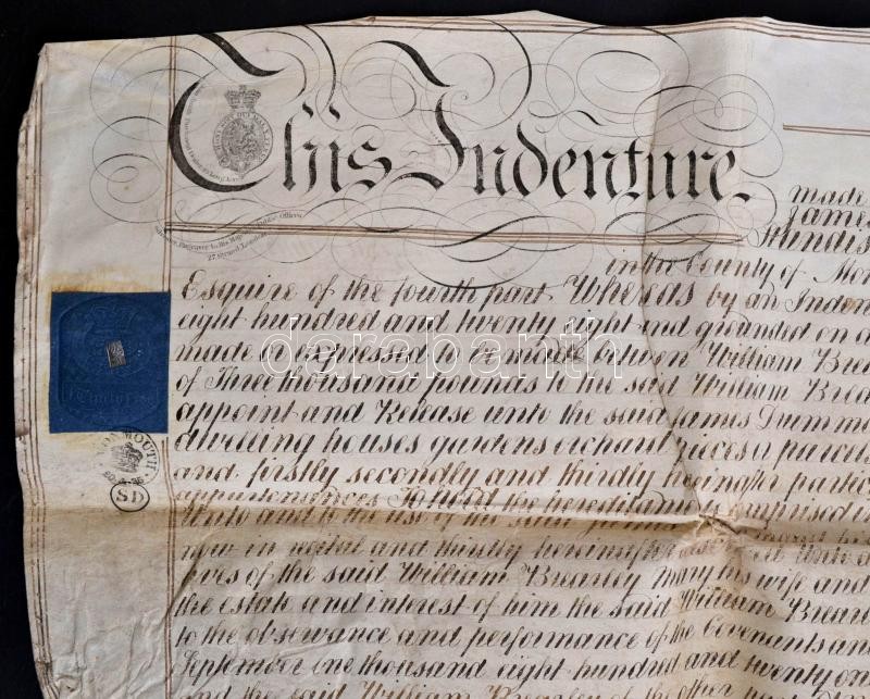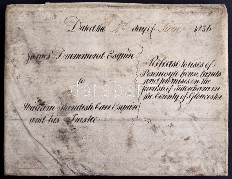1836 Haszonbérleti szerződés James Daummont Esquire és William Handish Carr Esquire és megbízottjai között a glouchesteri Tidenham plébánia fennhatósága alatt lévő Penmoyle majorság ügyében. Négy nagyméretű levélen, mindegyik szignettával. 75x60 cm / 1836 Contract. James Daummont Esquire release to uses of Penmoyle house lands and premises in the parosh of Tidenham in the County of Glouchester. 4 leafs with signettas