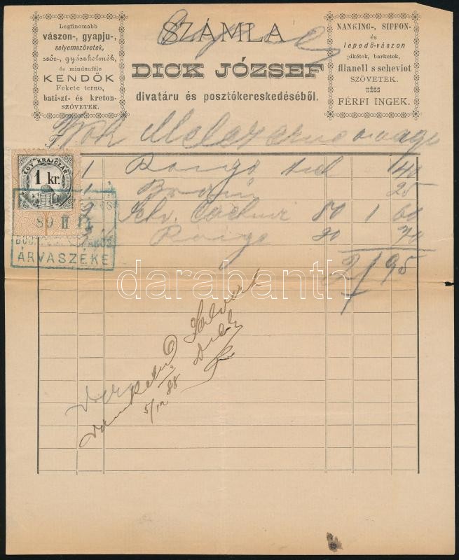 https://www.darabanth.com/en/345-Online-auction/345.0/Art-and-other-collectibles/Documents~500018/1888-Dick-Jozsef-divataru-es-posztokereskedesenek-fejleces-szamlaja-1-Kr-okmanybelyeggel~II1957124