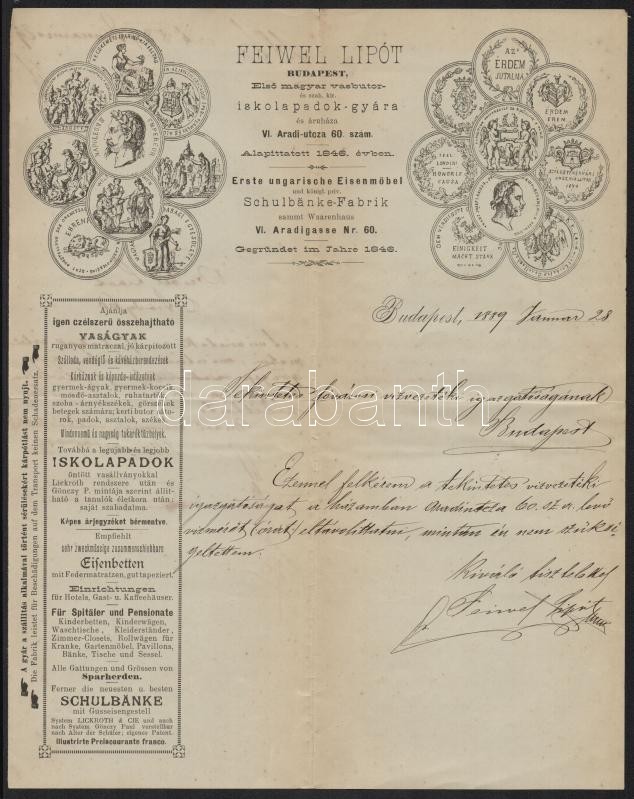 1889 Bp., Feiwel Lipót Első Magyar Vasbútor és Iskolapadok Gyára fejlé...
