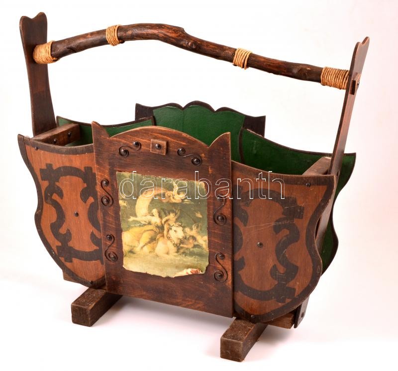 XX. sz. eleje: Fa újságtartó intarziával, ráragasztott képpel 60x54 cm