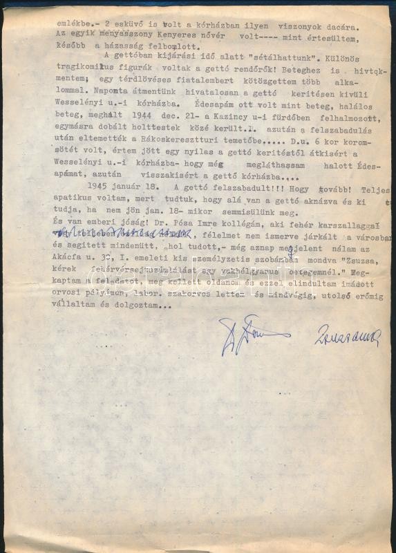 Description: 1988 A pesti gettókórház orvosa voltam ... dr. Dénes Zsuzsanna visszaemlékezése 1988-ból, az 1944. november - 1945. január 18-diki időszakra, 2 gépelt oldal, eredeti aláírással