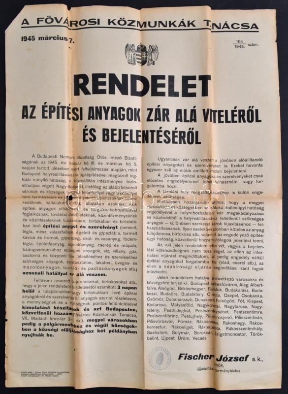 Description: 1945 Rendelet az építési anyagok zár alá vételéről és bejelentéséről, a Fővárosi Közmunkák Tanácsa hirdetménye (márc. 7.), bélyegzővel, a hajtások mentén szakadásokkal, 63×46 cm