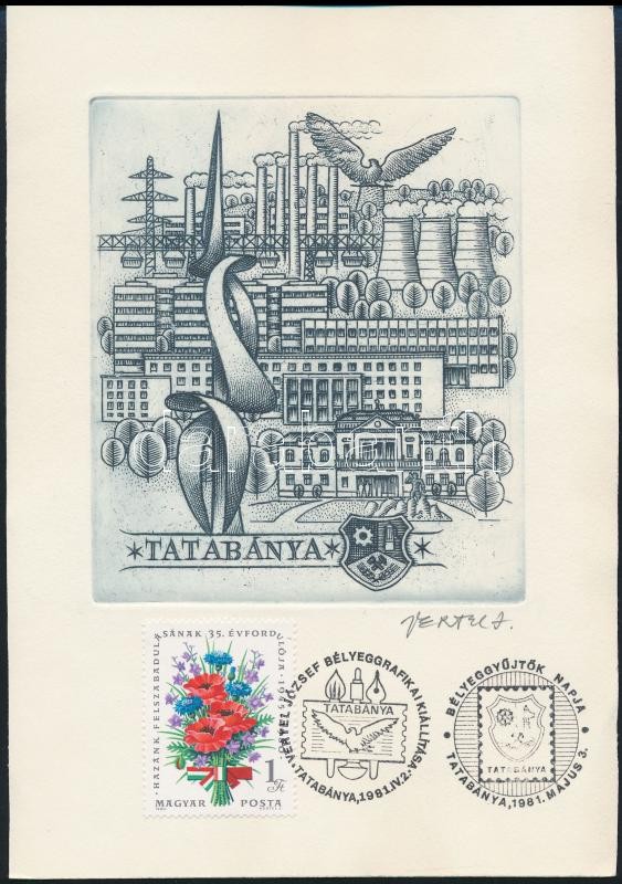 Vertel József (1922-1993): Tatabánya. Rézkarc, papír, jelzett, 10x11 cm. Alkalmi bélyegzéssel