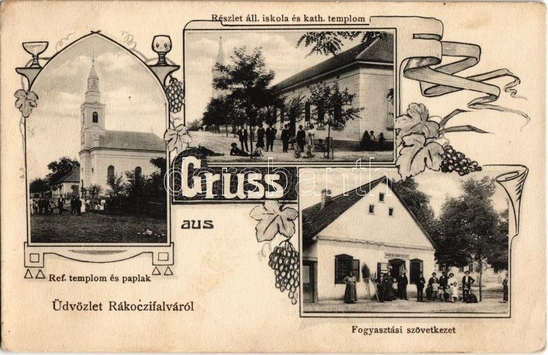 Description: 1911 Rákóczifalva, Református templom és paplak, Állami iskola és a katolikus templom, Fogyasztási szövetkezet üzlete, falhoz állított seprűk. Kiadja Stern Zsigmond. Art Nouveau, floral (EK)
