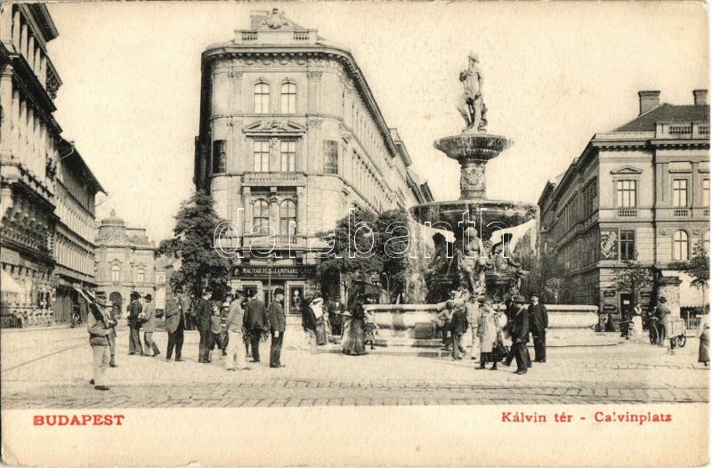 Budapest VIII. Kálvin tér, szökőkút, Magyar fém és lámpaárugyár, vendé...