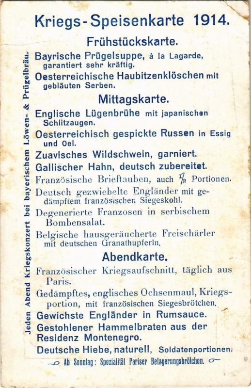 Kriegs-Speisenkarte 1914. des Gasthauses z. "Bundestreue" / WWI Austro-Hungarian and German military humour, war menu (EB)