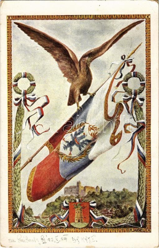 1914 Ljubljana, Laibach; Ljubljanski grad / Ljubljana Castle, coat of arms, Slovenian flag (EK)