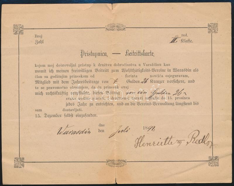 1892-1895 Varasd, Jótékonysági klub tagdíjbefizetéséről szóló 2 db okmány, német és horvát nyelven.