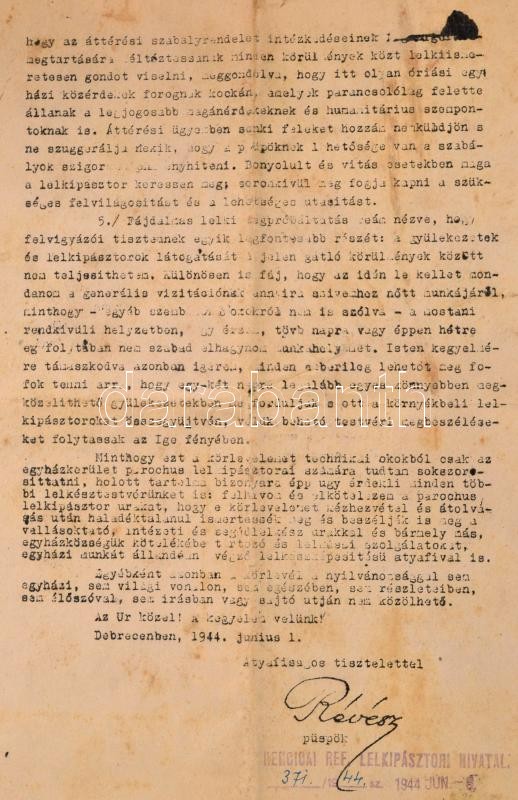 Description: 1944 Révész Imre (1889-1867) tiszántúli református püsök körlevele a vészterhes időkben az egyház tagjai által tanusítandó viselkedésről 8 gépelt oldal