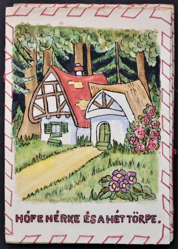cca 1930-1940 Hófehérke és a hét törpe, kétoldalas amatőr gyerek kifestő, kézi fűzéssel, kézi rajzolással, utólagos színezéssel, festéssel, jelzés nélkül, 18x62 cm