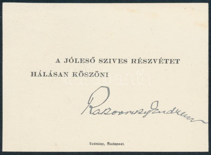 cca 1937 Rakovszky Endre (1961-1945) ny. főispán, felsőházi háznagy részvétnyilvánítást köszönő kártyája, aláírásával